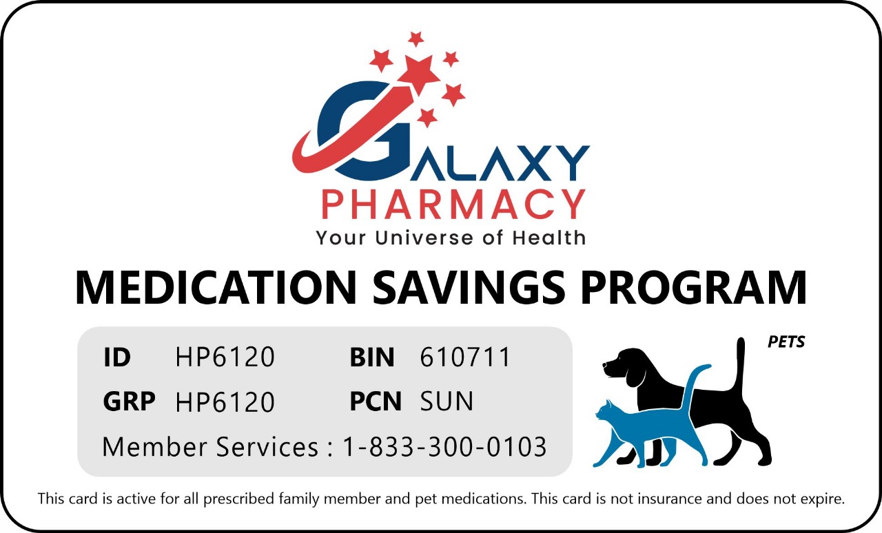 The Galaxy Pharmacy medication savings program provides discounts of up to 87% off retail prices at all major chains and most independent pharmacies nationwide.